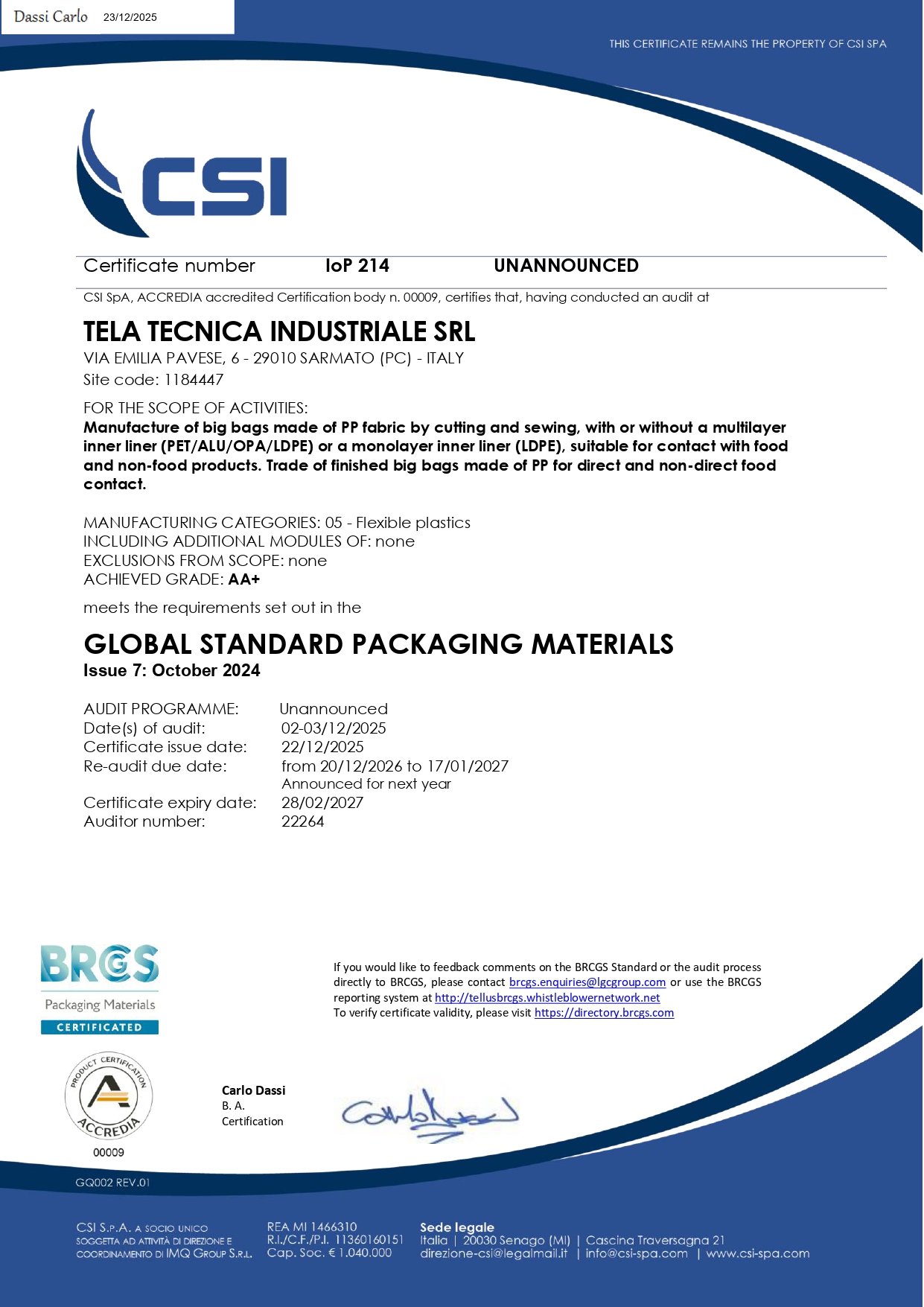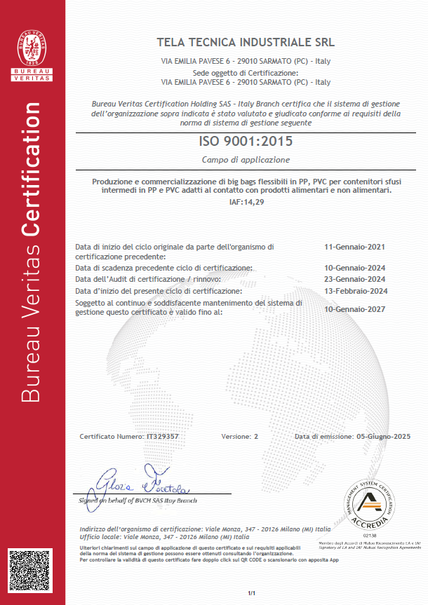 Tela Tecnica Industriale è stata la prima azienda in Italia a ottenere la certificazione BRCGS per la produzione e commercializzazione di sacconi Big Bag, il quale rappresenta lo standard globale per i materiali da imballaggio che garantisce il rispetto delle norme igieniche e la sicurezza alimentare.